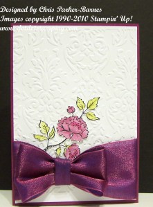 I have used Rich Razzleberry cardstock and Whisper White which I have run through the Big Shot with an embossing folder to create that gorgeous but subtle background. The image is from the Asian Artistry Hostess set from the current mini catalogue, stamped in Stazon ink and then coloured using a blender pen in Kiwi Kiss, Rich Razzlebery with a touch of Melon Mambo. The flower has then been cut out with paper snips and glued on.