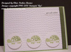 The cardstock I have used for this one is Certainly Celery and Whisper White, the turtles are inked in Certainly Celery and then “thumped” using an Almost Artichoke marker for the dark spots. The ribbon is also from my own stash.