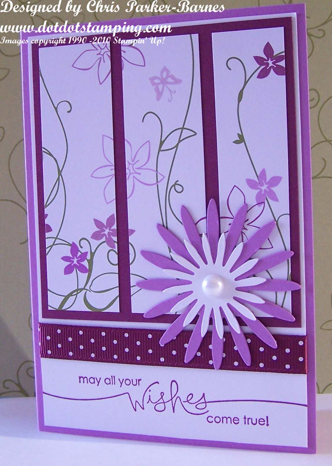 This card features the very soon to be gone Cottage Wall DSP, with cardstock in Rich Razzleberry, Orchid Opulence and of course, Whisper White. I have stamped the greeting from “Heard from the Heart” stamp set in Rich Razzleberry and also used the polka dot ribbon in the same colour. The die cut flowers were a present from a very special friend (thanks Kerri) and I have used a half back pearl from the Pretties Kit.