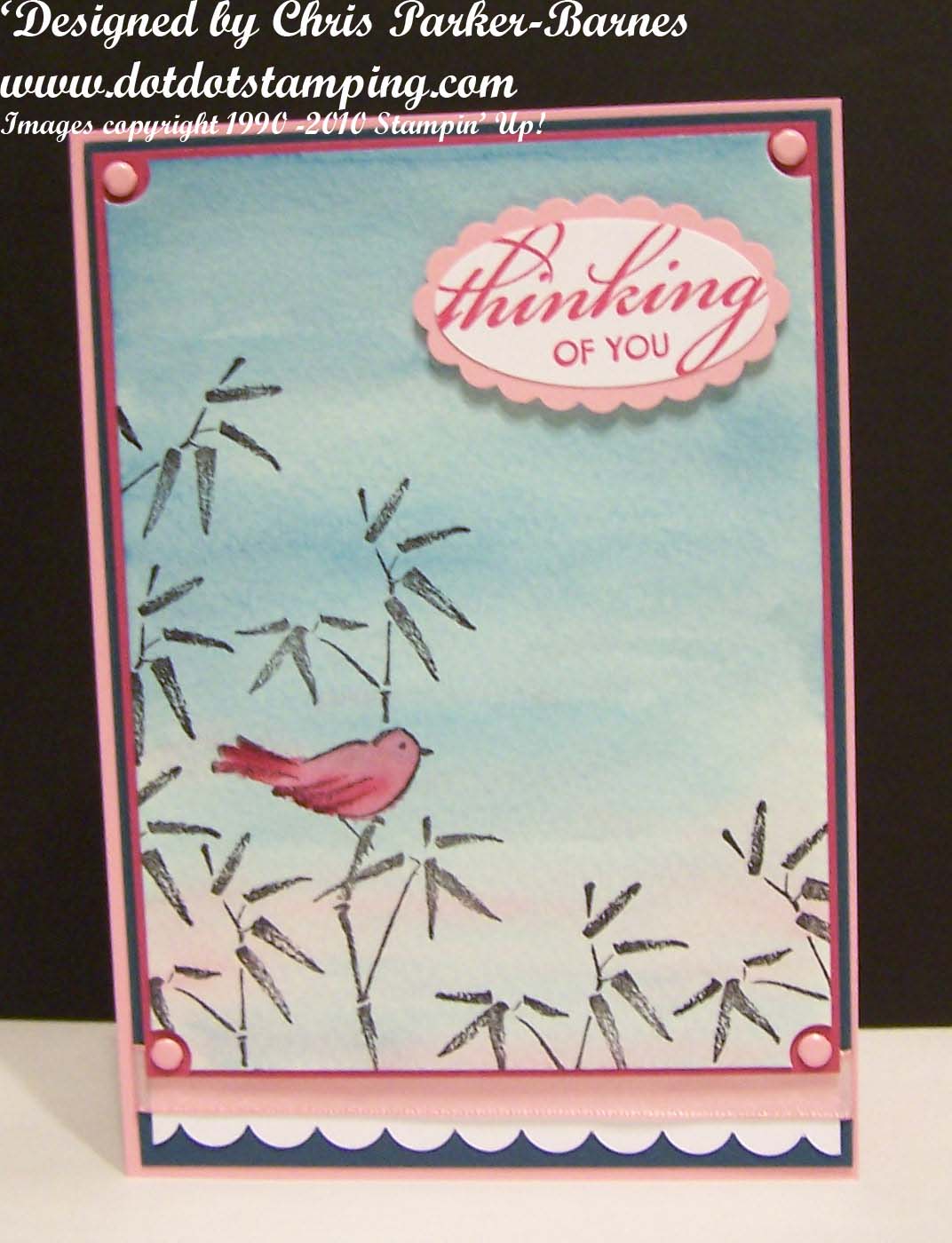 So, I used Not Quite Navy ink with an Aquabrush for most of the background, then just used a tiny bit of Rose Red ink for some contrast at the bottom. Then I stamped the image from the beautiful Asian Artistry stamp set, (currently a hostess set, but not for much longer), in black Stazon ink, and coloured the bird in Pretty in Pink and Rose Red with Markers. And the greeting is from Three Thoughts stamp set.