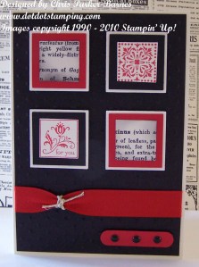 I have also used the new Newsprint Designer Series paper, along with the Polka Dot Embossing folder on the black background (it’s a bit hard to see in the photo). The colours used in the card are Basic Black, Real Red and Very Vanilla.