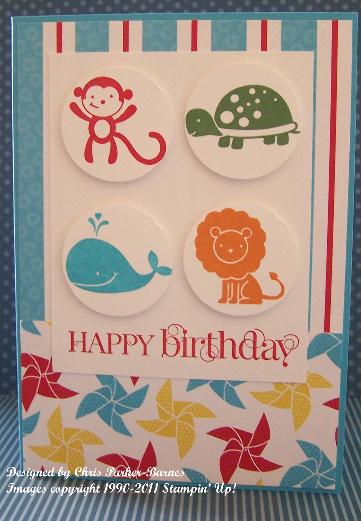 The Big Top Birthday Designer Series Papers make it sooooo easy to make kids cards.  Stampin’ Up! have literally done the work for you.  This first card is just a strategically cut layer of DSP on a base card of Tempting Turquoise, a greeting (this one from On Your Birthday) stamped on white and then punched out with the Large Oval Punch and adhered with some dimensionals.  And that’s done!  Of course you could do more with it, but if you are after a quick and really easy card, this is it!  This week’s Stampin’ Royalty challenge is a simple card, so I think this one fits the bill nicely.