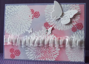 wonderful background, I love those great big white flowers with the little touch of the hot pink flowers… great ribbon as well!