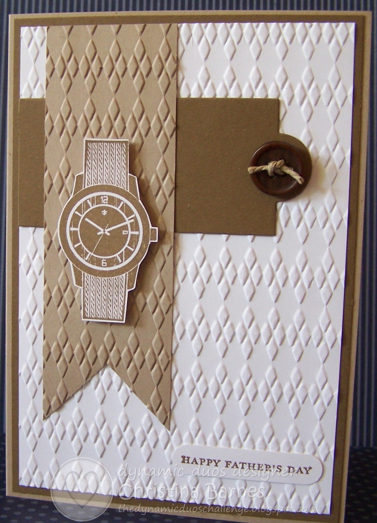 In my previous post, I started on some tips for making masculine cards. So here is another one… I guess this might be obvious from the cards I have made here, dry embossing (using Textured Impressions Embossing folders) make great backgrounds for masculine cards, giving lots of texture and interest. Great ones to keep in mind are the one I have used here, which is the Argyle, Square Lattice, Houndstooth, Perfect Polka Dots, Woodgrain (one of my favourites!), Chevron, Stripes, and definitely Spider Web. You can change the entire look of a card just by using a different embossing folder in the background. Give it a try and see what you like best.
