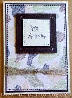 I have used some “camouflage” patterned paper, which I discovered amongst my stash of papers, and layered this over some Early Espresso cardstock.  Then I have done some of my favourite “faux stitching” around the edge of the patterned paper.  The words come from the Bloom With Hope stamp set, and the frame has been run through the Big Shot with one of the Fun Frames embossing folders.  Some Linen Thread knotted in the centre, and some small silver brads in the corners of the frame for some finishing touches.