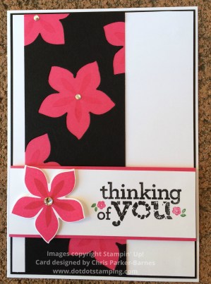 My card features the Flower Fair Framelits Dies and matching Flower Patch stamps. The flower shapes have been cut out of the black layer of cardstock, and then placed over some Melon Mambo cardstock.  Then some smaller flowers have been stamped onto the pink layer to look like the centres of the flowers.