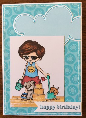 Beach Boy has been coloured with Copic Markers and mounted on to some retired Stampin’ Up! patterned papers and stickers.