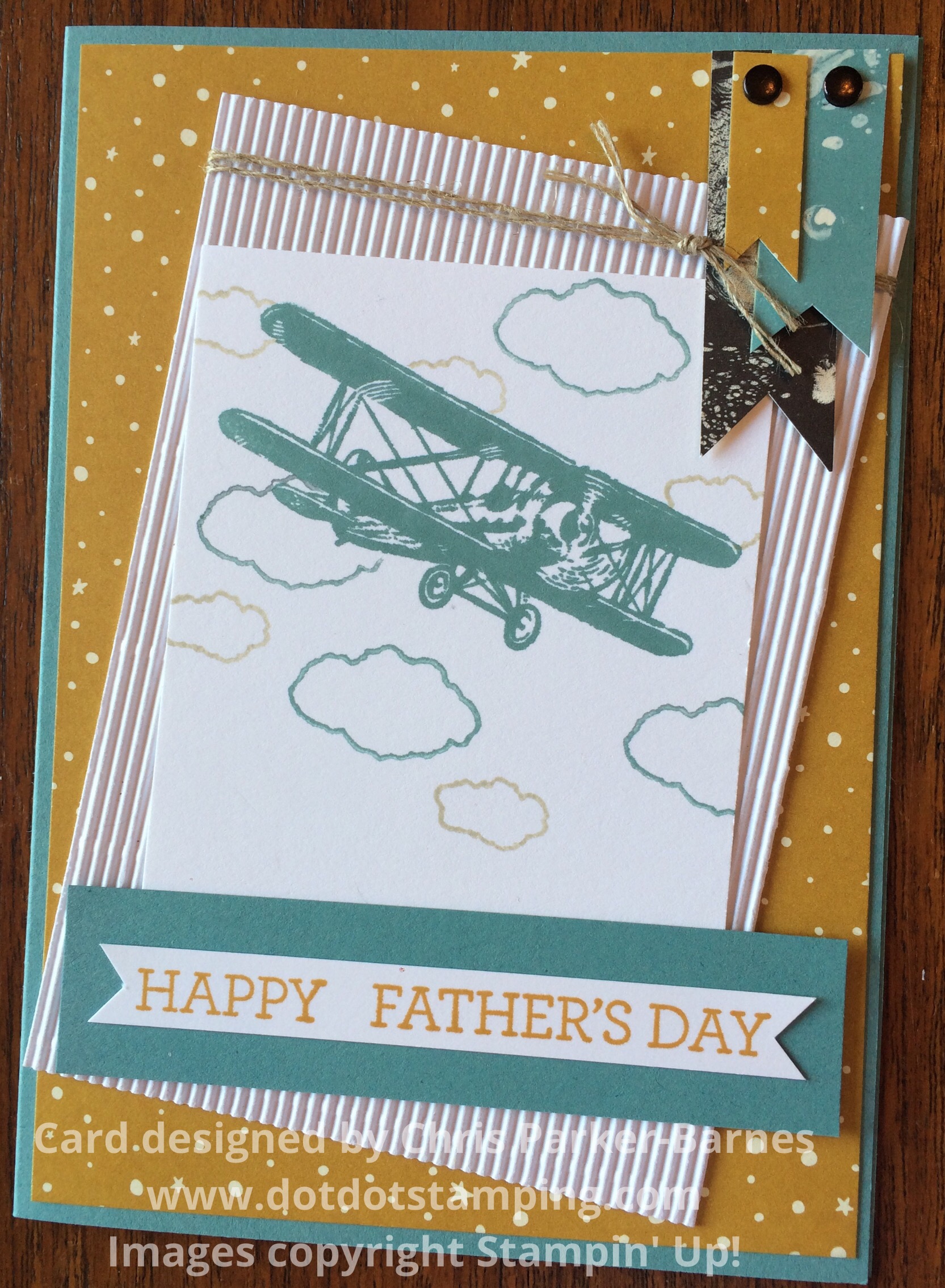 My card uses some lovely but sadly retired Stampin’ Up goodies. I love these papers for masculine cards, and of course the wonderful plane image. And I have added a layer of corrugated cardstock (also retired) for some texture.