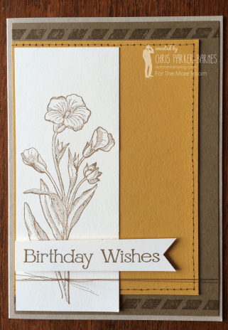 My card uses the flower image from Butterfly Basics stamp set, which I have inked up in Soft Suede, and then mounted on some masculine coloured layers.