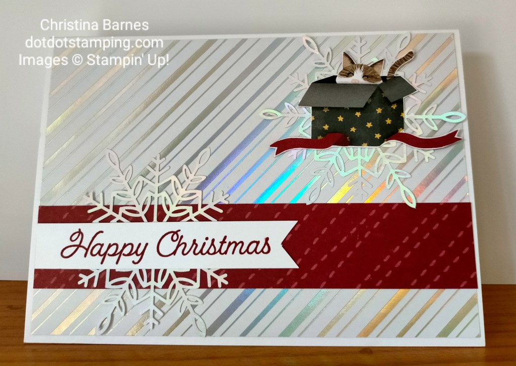 The card uses some of the Whimsy and Wonder Designer Series Paper in the background – it looks gorgeous and full of rainbows in the photo, and it didn’t matter which angle I too the photo, there were rainbows! In reality it is a beautiful silver. And cheeky kitty comes from the Sweet Stockings Designer Series Paper, which I have fussy cut. Both of these gorgeous Designer Series Papers will no longer be available once sold out.