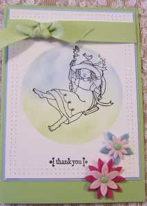 Today’s card uses a technique called reverse masking. Last night I held a class where we made three reverse masked cards, and this is not one of them! 🙂 However, I will post some of the cards we made in the class, but I wanted to share this one today, because it is so cute! 🙂 The card itself was a thank you card for one of my lovely hostesses who had a workshop recently, and I know her daughter just loves A Kind Word stamp set, and I don’t blame her! 🙂 Normally I watercolour the images from this stamp set, but this time used some sponging in the background to create the colour, and felt that was enough. Although I did just have to add some of those gorgeous felt flowers as well! 🙂