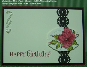 And part of the challenge was to use heat embossing as well. I have used heat embossing for the greeting here, and actually it was a bit more of a challenge that it should have been, as I am still trying to find my Heat Tool – probably still packed in a box from my move in December!! Although I thought all the important stuff ie stamping stuff, was together, so would have been the first things unpacked, but it’s in hiding. So I had to do heat embossing the old-fashioned way – that is, over the toaster! Yep that’s right – just make sure there is no toast in there first, otherwise you might get a fright when the toast pops out!