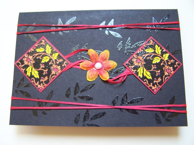This is the first time I have made a card for the Cinema Saturday challenge, but I thought it was a bit of fun, and would help me to create something a little different. This weeks movie is Crouching Tiger Hidden Dragon, which I have to admit, is a movie I haven’t seen, but I have used an Asian influence to make my card and and then added some red threads. Chinese Folklore says that there are invisible red threads that connect a new born child’s spirit to all the people who will be important in the child’s life. As the child grows, the threads shorten, drawing closer those people who are destined to be together. The threads are said to never break or fray, binding family and friends forever.