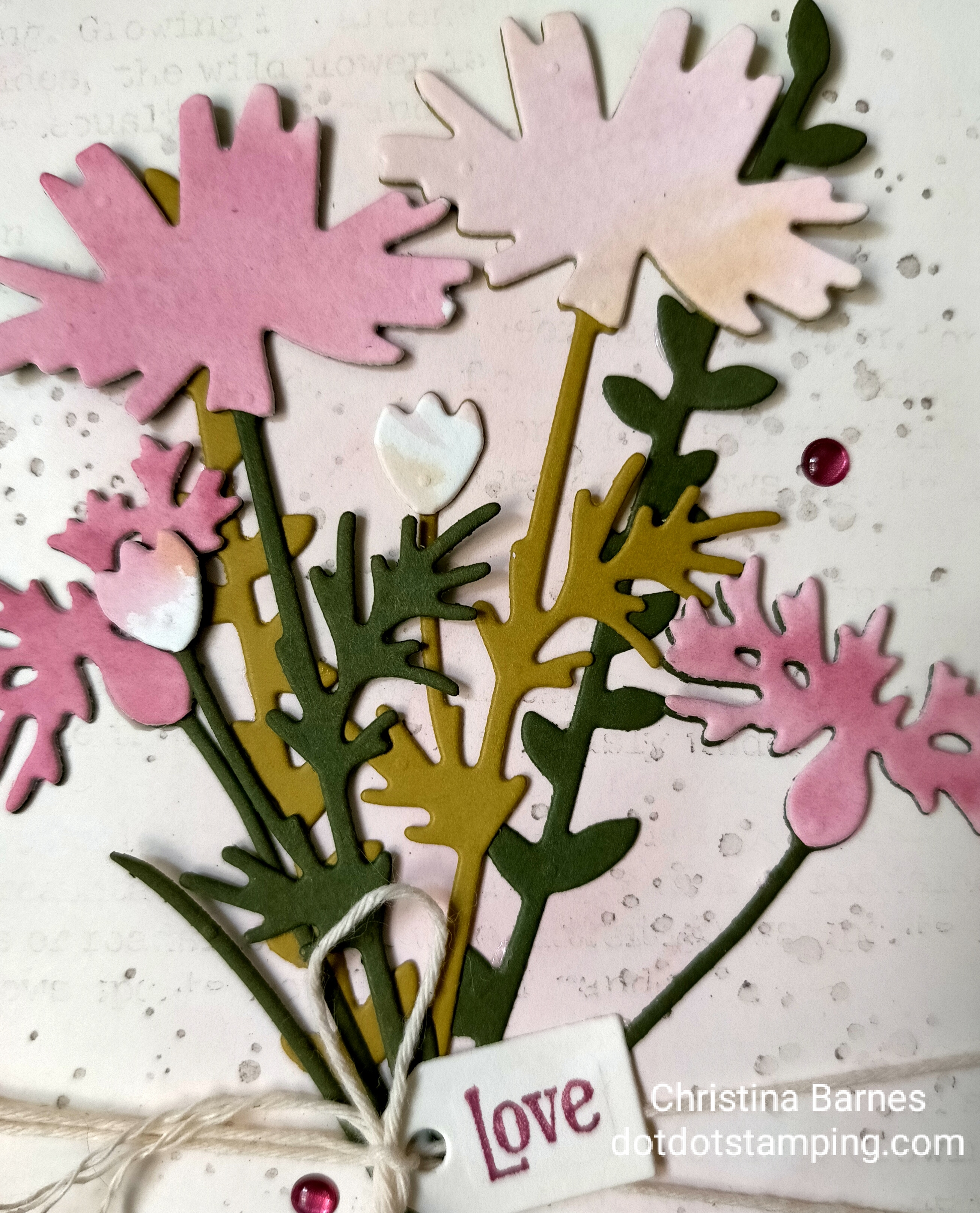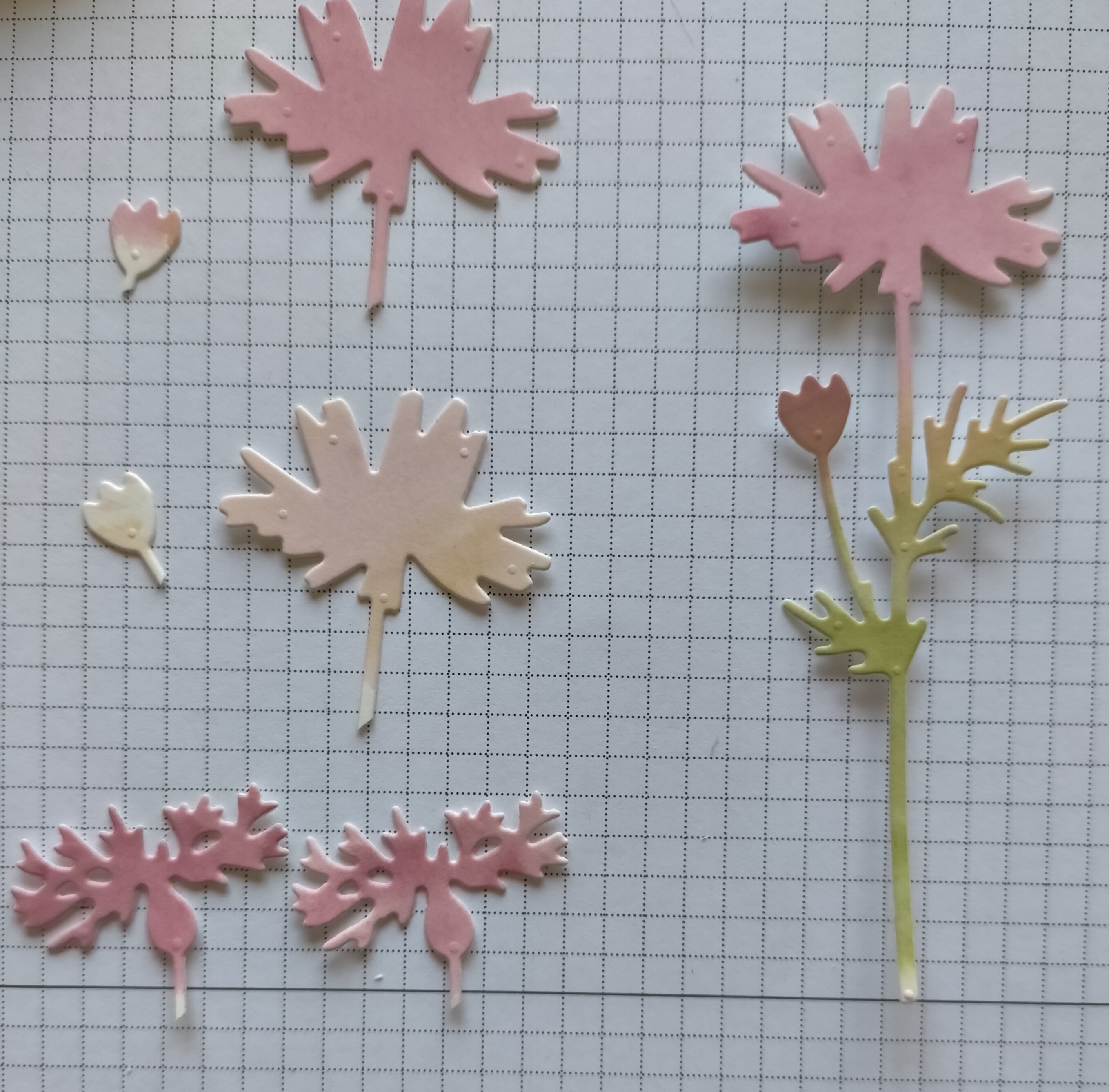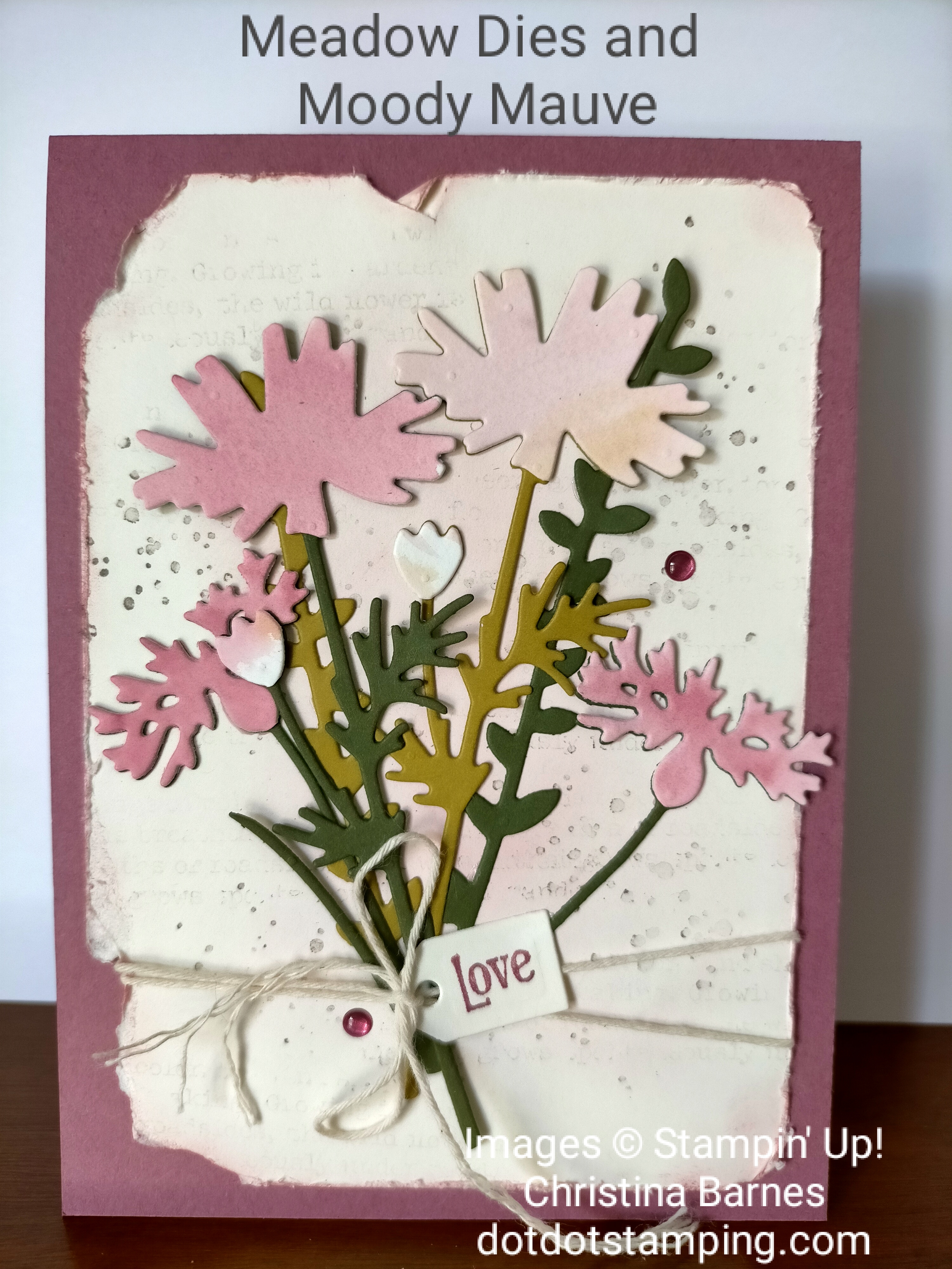 I have used some of the scraps of watercolour paper and coloured it with some Moody Mauve, Wild Wheat and Mossy Meadow ink and a Water Painter, before die cutting them with some of the Meadow Dies. I have also die cut the same in Mossy Meadow cardstock, and then overlaid the flower onto the Mossy Meadow, which gives a slight raised appearance to the flower, but also gives a shadowed effect where you can see the tiniest amount of the dark Mossy Meadow behind the flower.