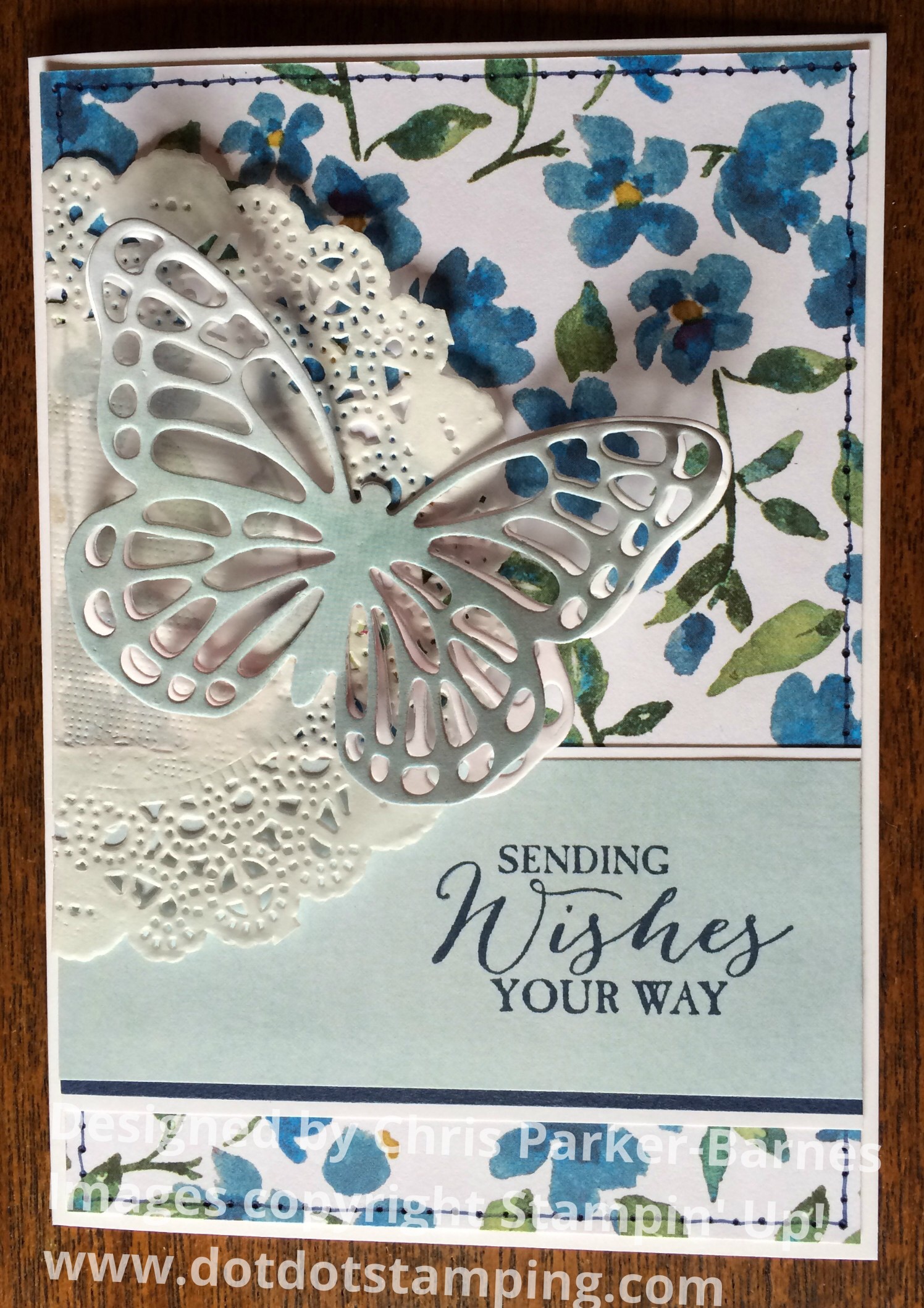 I have cut two butterflies, one from white cardstock and then the top layer from the blue watercoloured paper in the Painted Blooms DSP. Â The sentiment comes from the new stamp set (which is bundled with the dies) called Butterfly Basics.