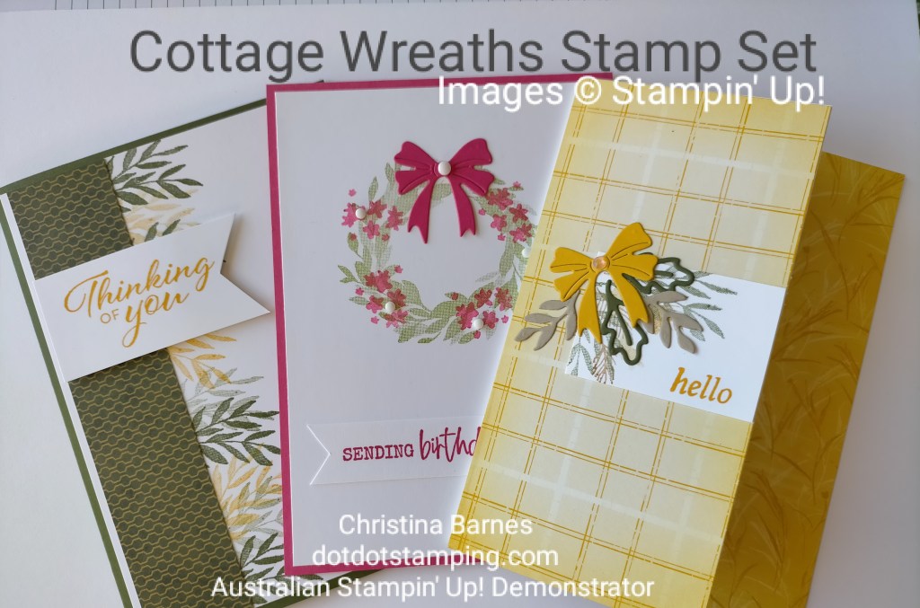 The kits to make the three cards are available for free to anyone who places a $30 order in my online store before midnight this coming Sunday 30th July (shipping extra). The kits will be sent out separately to your order. And just a reminder that due to Stampin’ Up! policy, I am unable to stamp images to include in the kits – that means you get to do the fun stuff! Don’t have the Cottage Wreaths stamp set? Try the cards with a different stamp set, that’s part of making creativity fun. Alternatively, you can order the stamp set and dies by clicking on the images below. Happy stamping, Chris