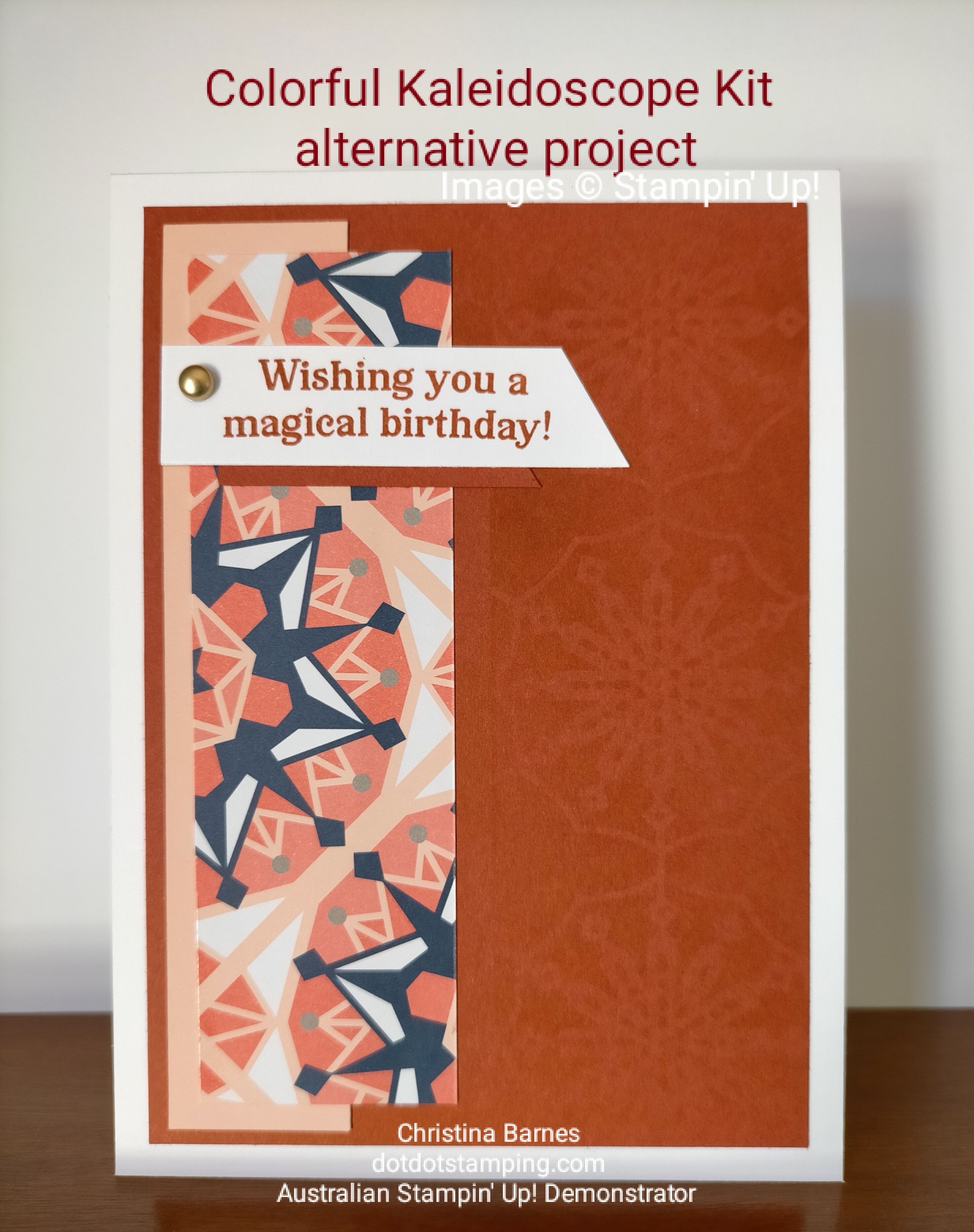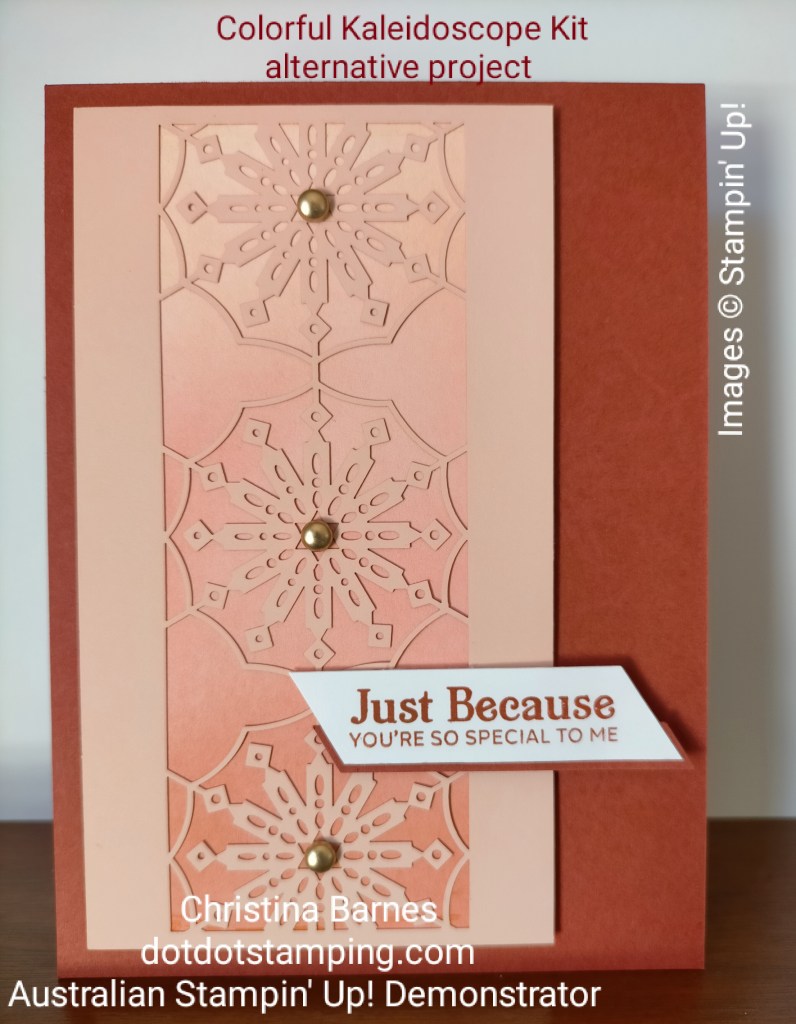 This week on the Colour Creations Blog Hop, we are featuring Cajun Craze. I have mostly used Cajun Craze as a fantastic colour for masculine cards, so today I am doing something a little different with it. I have used the Colorful Kaleidoscope Kit, and paired some of the kit elements with some Cajun Craze. I think it really helps the colours in the kit to pop. The Colorful Kaleidoscope Kit contains some gorgeous die cut layers, and I have used one of these on the reverse side, as a mask, which I have sponged through to create a subtle tone on tone background in Cajun Craze for both my cards. For the first card, I have then used the die cut mask on the front of my card. Behind the die cut panel is some white cardstock which has been sponged in Cajun Craze, Calypso Coral and Petal Pink to create an ombre effect.