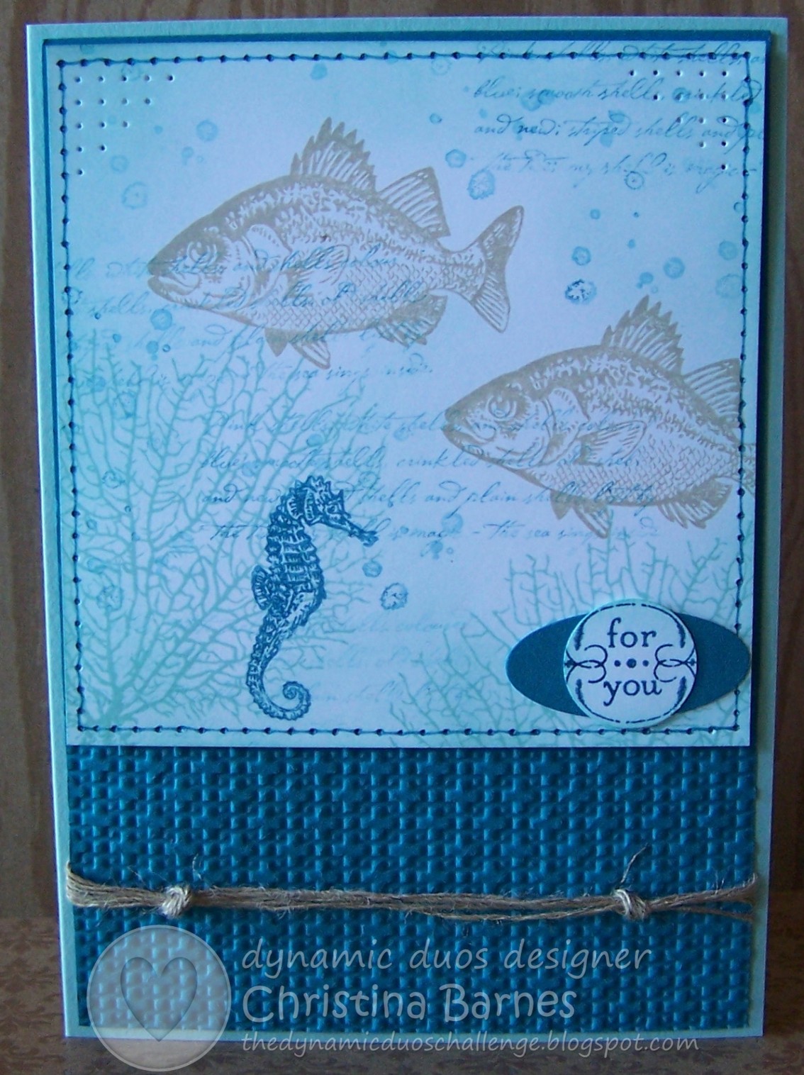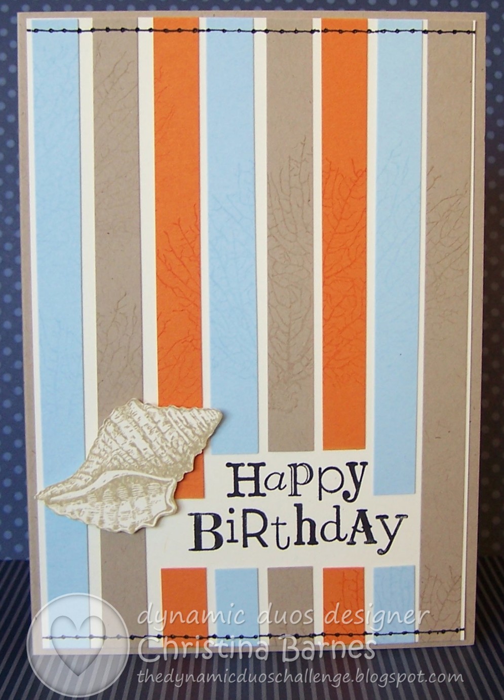 Firstly, I have stamped the sentiment from Wacky Wishes, then added the strips of coloured cardstock to the base (I have used some Crumb Cake along with the Bashful Blue and Pumpkin Pie). I have then stamped in Versamark ink, the seaweed image from By The Tide stamp set, over the cardstock strips. It is a little harder to see it in the photo than in real life. The shell image, also from By The Tide, is stamped in Crumb Cake and then cut out by hand. And of course, I had to add some faux stitching!