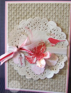 My card this week uses one of the gorgeous Doilies from the Seasonal Catalogue that have just been released.  I have stamped straight onto the doily using the swirl from the Everything Eleanor stamp set, in Pretty in Pink and Sahara Sand. It may be a little hard to see in the photo but there are also some of the swirls stamped onto the Sahara Sand background, which I then ran through the Big Shot with the Square Lattice Embossing Folder.  The flowers have been inked and then hand cut, and the red flower has been coated with Crystal Effects to give it a nice shiny finish.