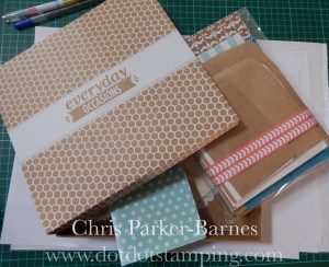 The card is the same as one of the pre-designed cards, and to make it “Christmassy”, I have just punched out a tree, and a star, stamped a sentiment, and there it is….done! Very quick! The Christmas tree is punched out of the Under the Tree DSP, and the “Merry Christmas” comes from the Teeny Tiny Sentiments stamp set.