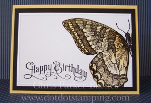 I have heat embossed the butterfly using black embossing powder onto white cardstock and then coloured inside the embossed areas using So Saffron ink and a blender pen, and just gently going over and over the areas so as not to rough up the cardstock.
