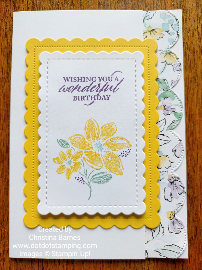 My first card is a simple fun fold card, where I have paired the Blueberry Bushel with some Parakeet Party. As a former professional musician, the stamp set Enjoy The Rhythm was one I had to have, but it has been sadly neglected recently, so I thought I should use it for this challenge. The drum kit has been coloured with Stampin’ Blends, and I have used some Glorious Gingham and Bright and Beautiful Designer Series Papers.