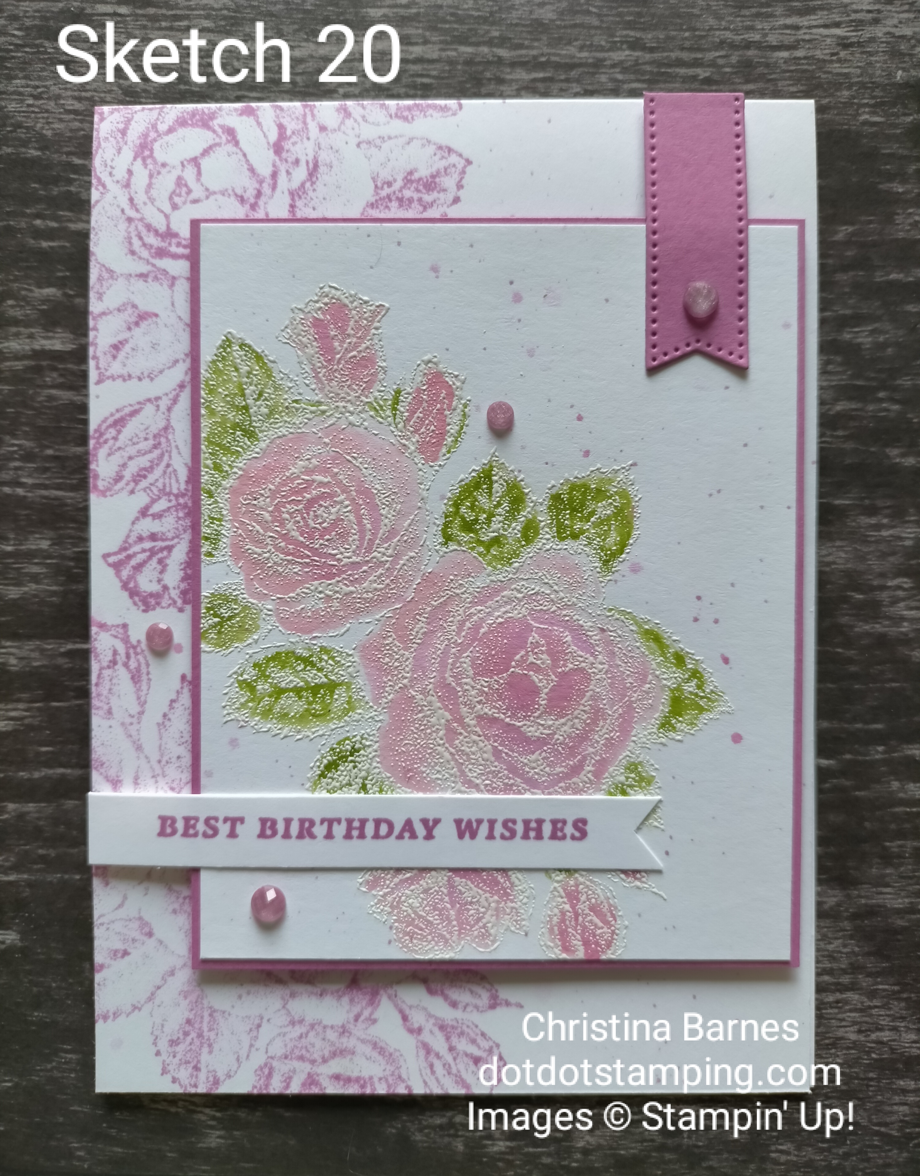 I have gone back to one of my all time favourite stamp sets, the Stippled Roses stamp set, which I have stamped onto the cardbase in Petunia Pop ink, after stamping it off once onto scrap paper.