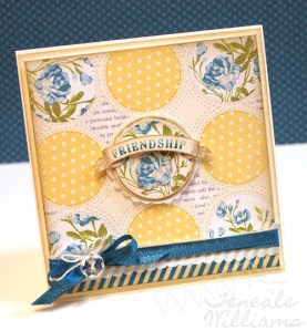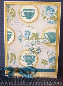 The patterned paper is called Tea For Two and is from the current Seasonal Catalogue. Isn’t it just gorgeous? Because the paper refers to “Tea” I thought it was only fitting to use the Tea Shoppe stamp set, one which has been a little neglected of late. The individual tea cups have been punched out using a circle punch and then layered with some dimensionals, over the yellow circles on the paper. I have also stamped and then fussy cut the flower from the stamp set and popped it in the bottom tea cup. Add some of my favourite faux stitching around the edge of the So Saffron layer of cardstock, lots of sponging on the edges, a pretty ribbon and bow, and a Vintage Brad, and there is my version.
