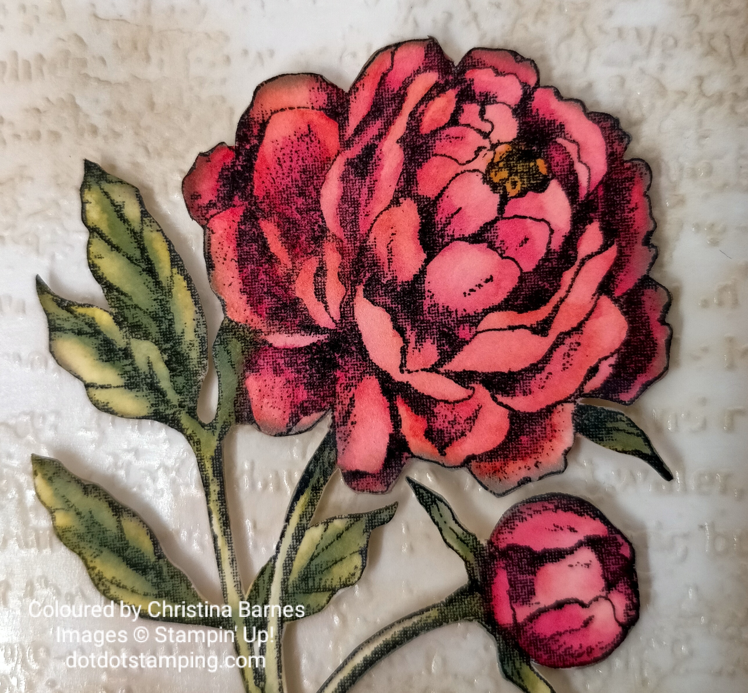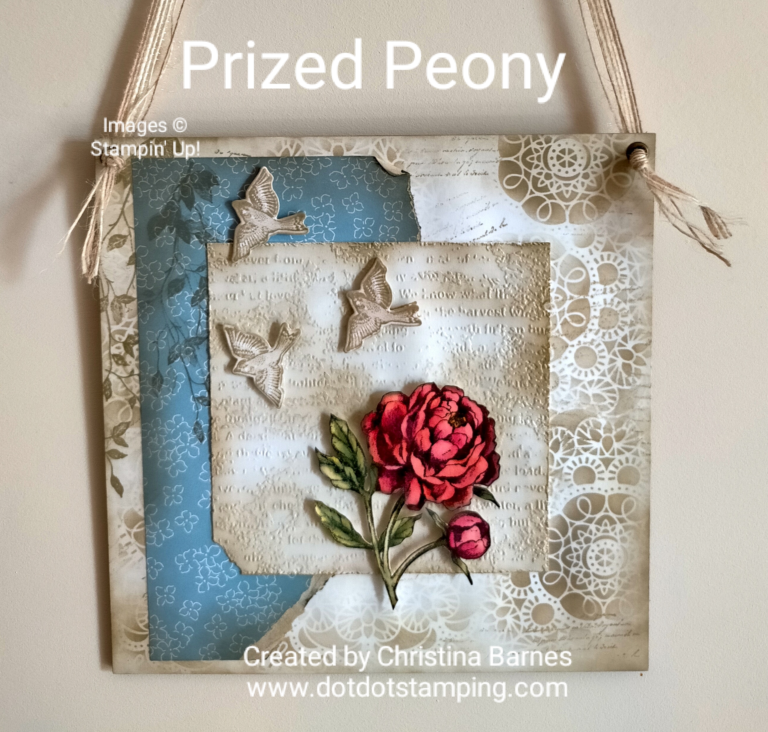 I spent most of my morning creating this piece, which I’m not quite sure what to call. It’s not really mixed media because it’s all the same techniques we would use on cards. I have made it for a local art gallery which is having an exhibition where everything that is displayed must be 8 x 8 inches. So I started with a piece of very heavy card, the type that sometimes comes in with the Specialty Designer Series Papers, which I cut to 8 x 8 inches, and also cut one of my pieces of Basic White cardstock the same size (the very same Basic White that I am trying not to use too much of right now!!). I have sponged the edges with Crumb Cake ink, and then a heap of sponging with daubers over a decorative mask which was actually the front of a retired laser-cut card. So heaps of sponging and stamping, and then watercolouring the Prize Peony. For that I have used Stazon Black ink onto Watercolour Paper, then coloured with ink and the Water Painter. The ink colours are Old Olive, Daffodil Delight, Calypso Coral and Polished Pink.